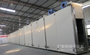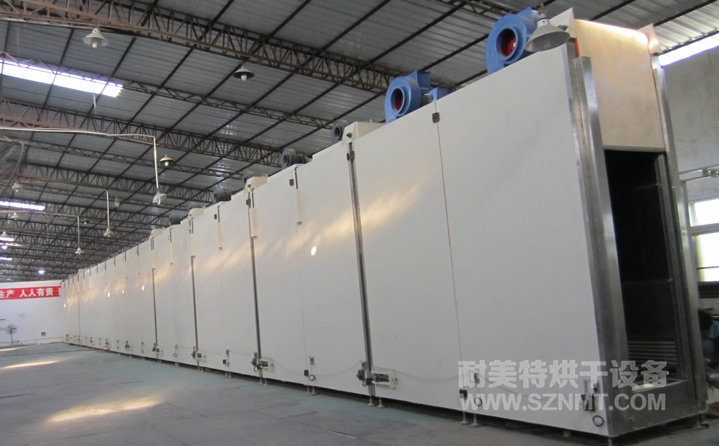 箱體內(nèi)膽尺寸:寬0.9米*高2.9米*長40米; 箱體共分為10段,每段長度=4米,其中預(yù)熱2段,烘干4段,程序降溫3段,強制冷卻1段;