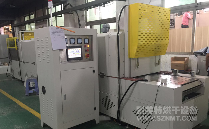 烘干部分總長4800mm,前后配自動提升門,緩沖區(qū)兩端各長300mm,冷卻區(qū)長1200mm, 進料部分長600mm,出料部分升降接駁臺長700mm ;